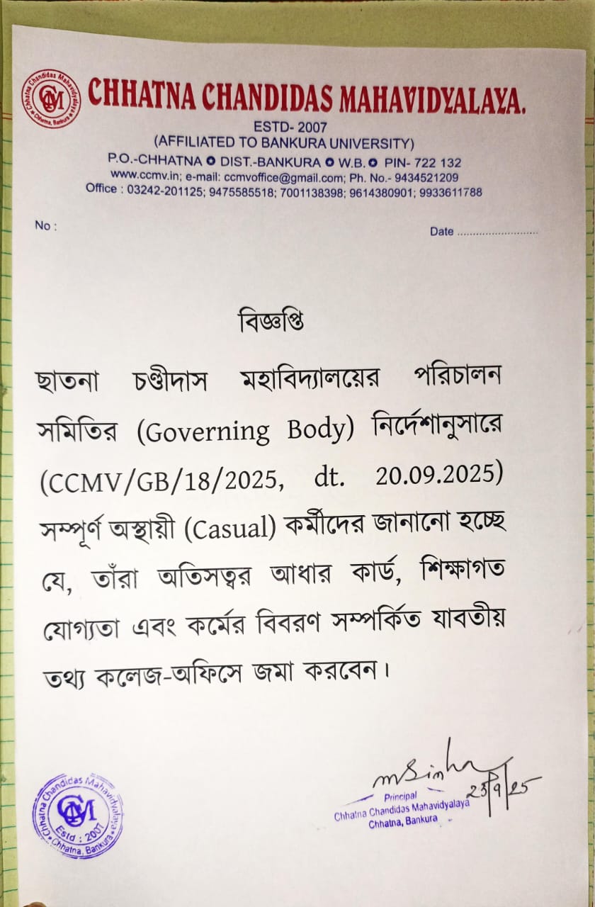 Chhatna Chandidas Mahavidyalaya started journey on 02/08/2007. Chhatna Chandidas Mahavidyalaya is located in Chhatna Block, Bankura District, West Bengal. It is located 15 KM towards west from District headquarters Bankura. A common belief that the Chhatna is the birthplace of Poet Chandidas (14th Century). College is well connected to the roadwa